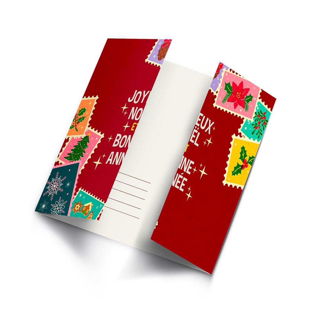 La carte de vœux 3 volets s'ouvre par le milieu est laisse apparaître les 3 volets. Imprimée sur papier épais, elle peut être pelliculée pour un meilleur rendu et un aspect plus haut de gamme. Attention toutefois à ne pas pelliculer le verso si vous voulez écrire dessus.