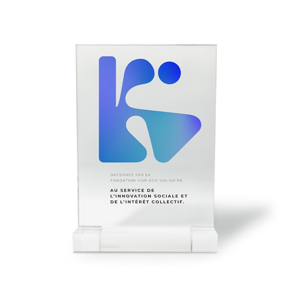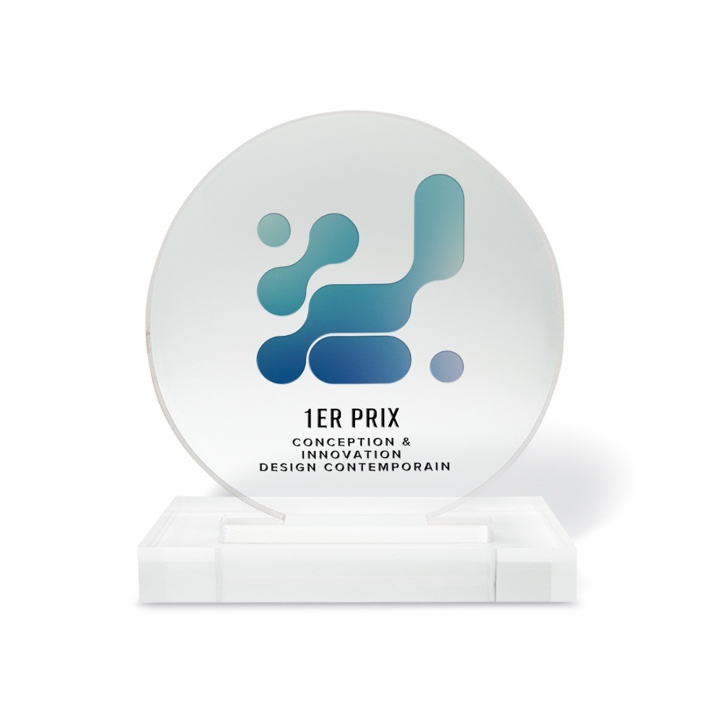 - Plexiglass 5 mm avec socle en plexiglass 10 mm — élégant et léger, parfait pour les événements et remises de prix